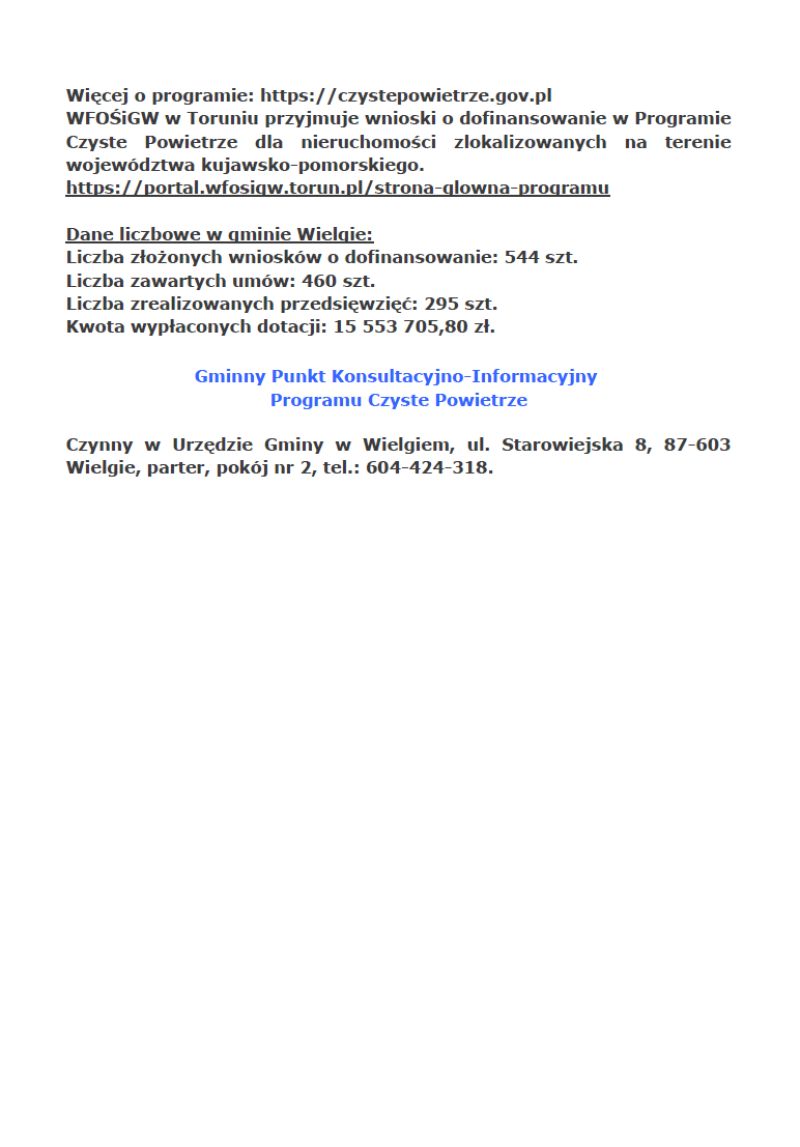 Gminny Punkt Konsultacyjno-Informacyjny Programu Czyste Powietrze - czynny w Urzędzie Gminy w Wielgiem, ul. Starowiejska 8, 87-603 Wielgie, parter, pokój nr 2, tel.: 604-424-318.